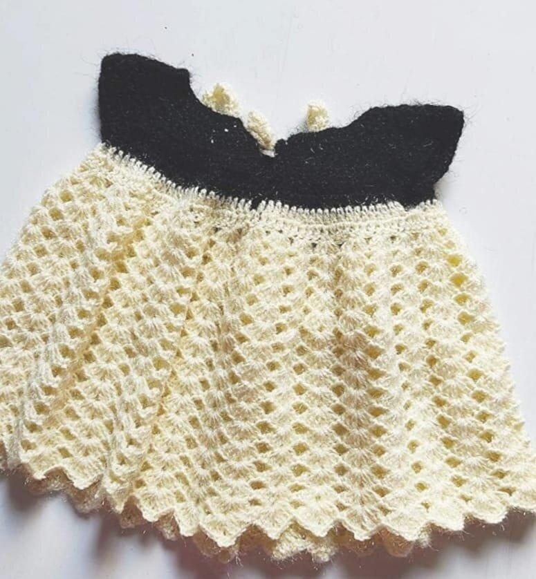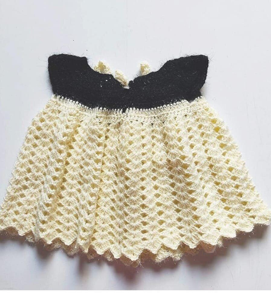 Handmade Crochet Baby Frock In Cream & Black | Party Wear Dress For Your Baby Girl