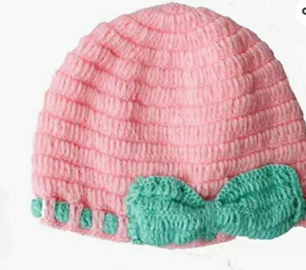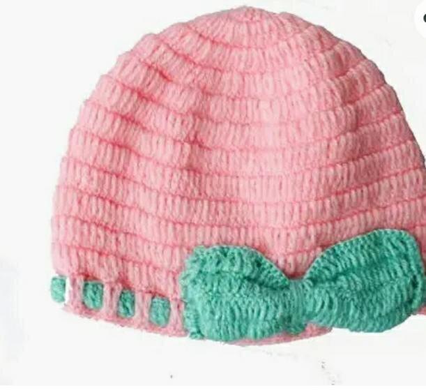 crochet baby hat with bow, pink cap with green bow, 1 year baby beanie