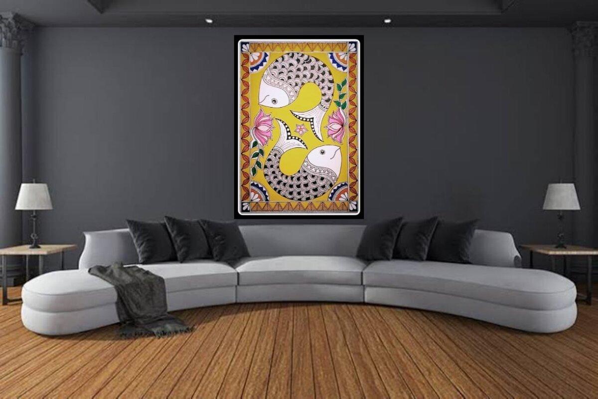 Madhubani Hand Painting, Pair Of Fishes, Original Handmade Painting, Indian Traditional Folk Art, Home Decor From Bihar