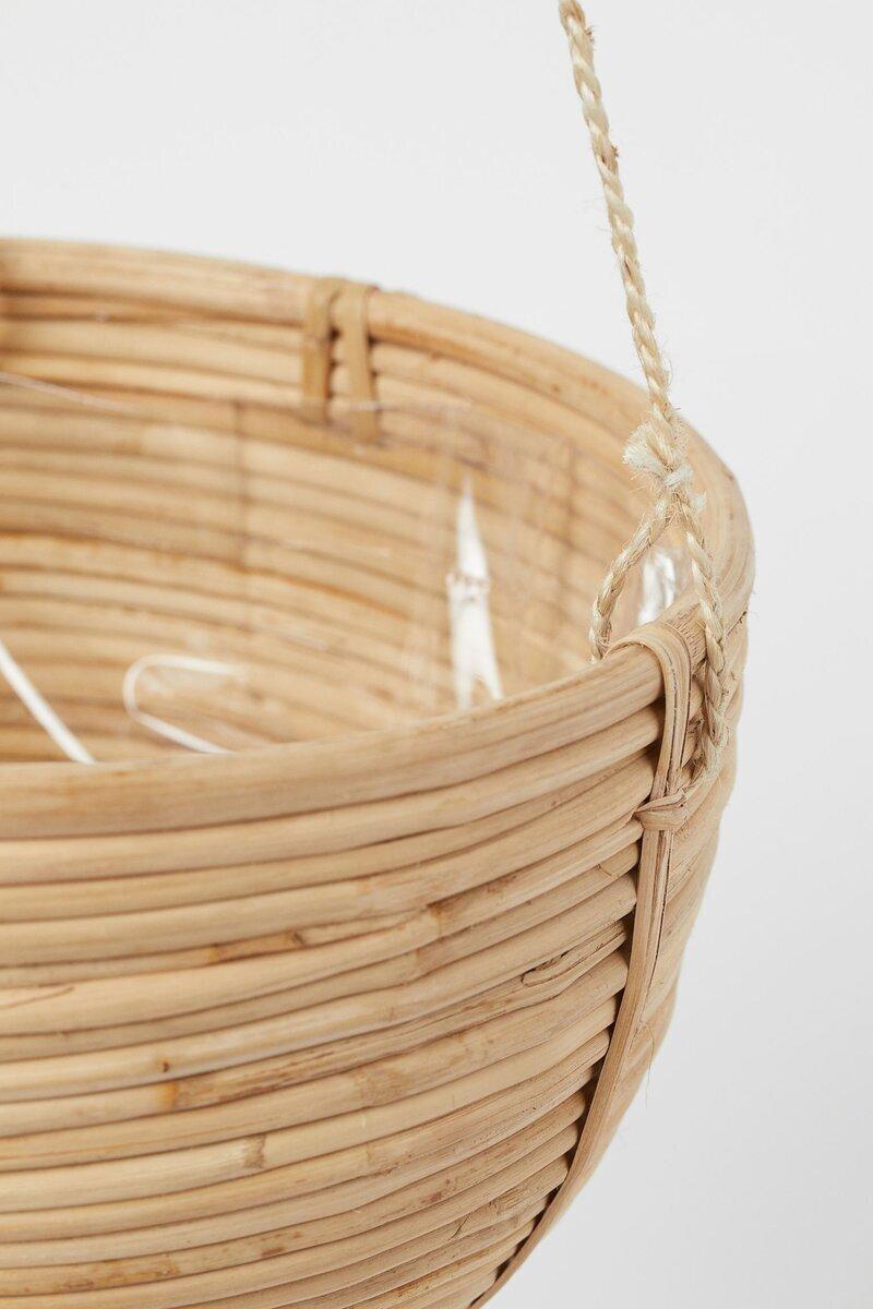 Large hanging basket in braided rattan with three cords and a metal ring at the top.