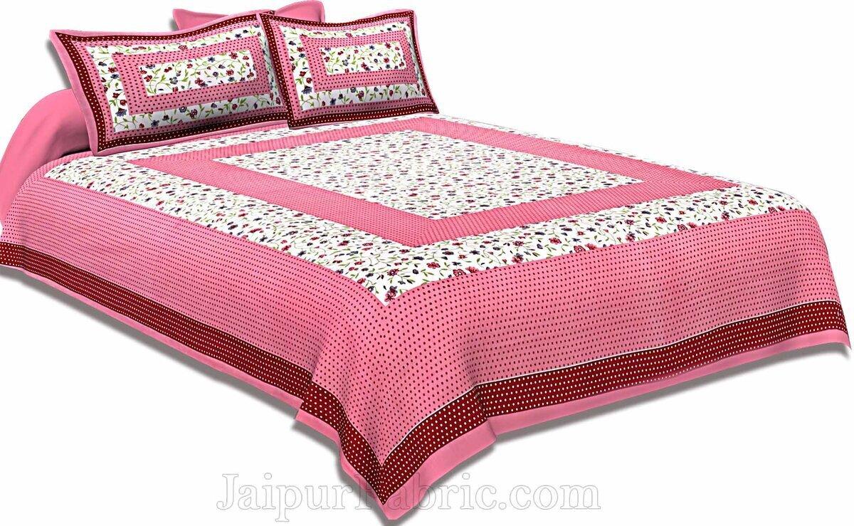 Floral Double Bedsheet Pink Color Dotted Border with 2 Pillow Covers