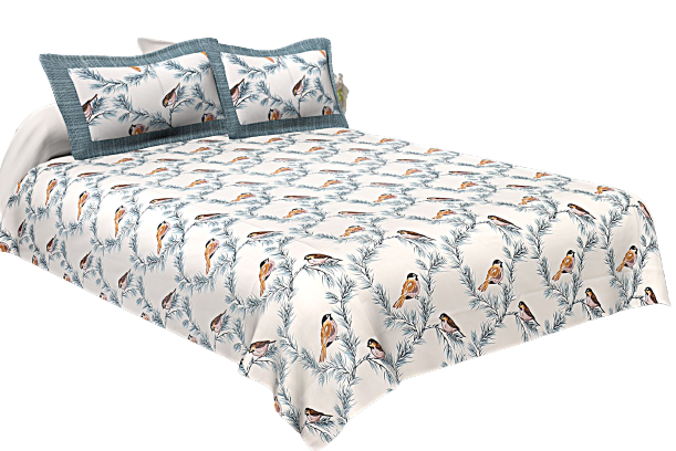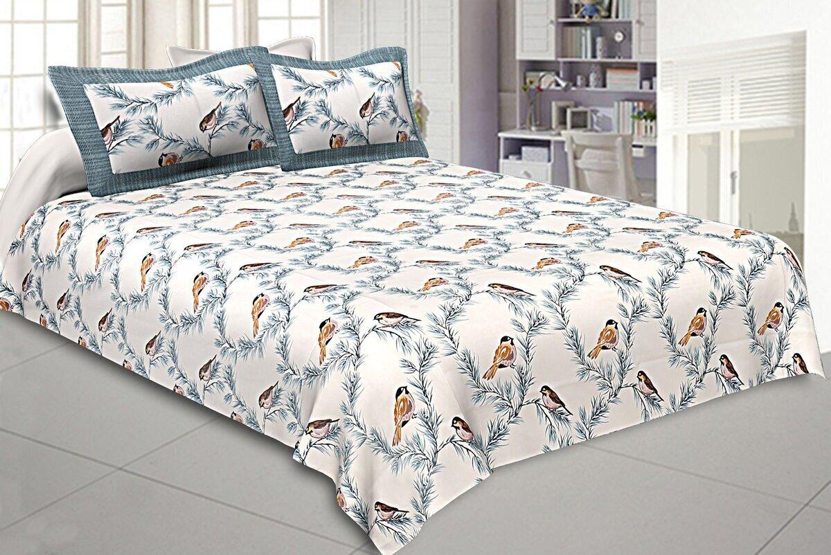 Indian Bird Blue Print Beautiful Color Bedsheet, Pure Cotton 240 TC Bedspread, Bedding, Cotton Fabric Bird Print Bedsheet With Pillow Cover