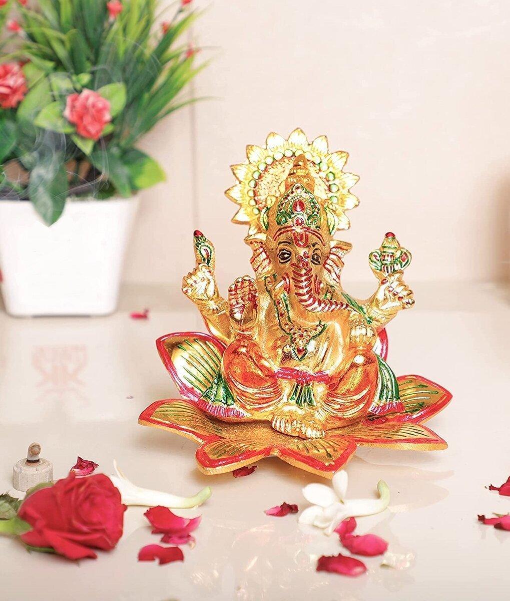 Religious Ganesh ji idol sitting on flower Ganesh Multi color Leaf For Home Decor. The product is gold plated with antique finish Multicolor so looks very beautiful and use for the purpose of worship and for home decorative. It's design to looks traditional stylish and inspiration from the day's of royal touch, that is made in white-metal casting with Gold antiques finish, white metal to bring elegance to your home.