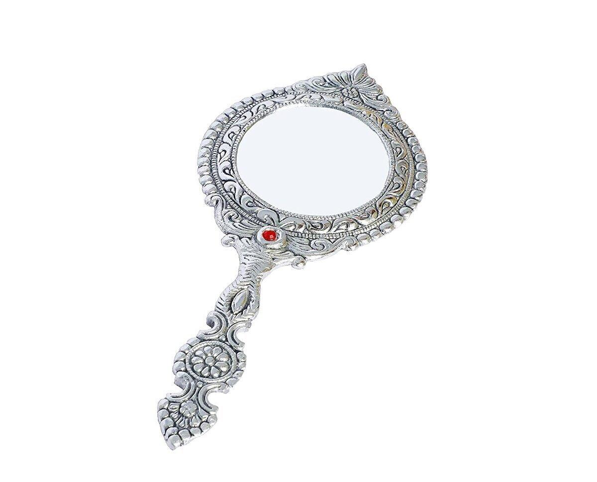 Beautifully Carved Round Shape Silver Plating Metal Hand Mirror for Makeup, Travelling, Salon Mirror & Decorative Mirror Antique Item for Wedding Gifts