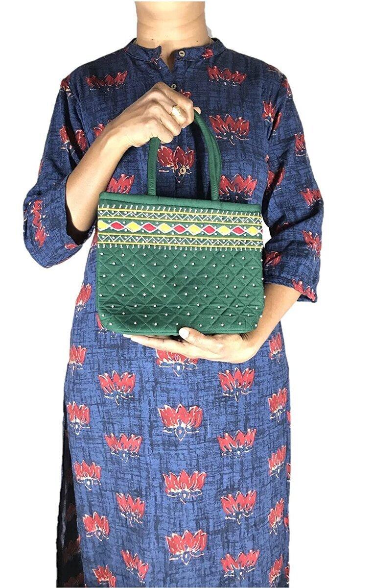 SriShopify Handicrafts Women's Handbag, MINI Handle Bag, Banjara Traditional Ladies Purse, Cotton handmade, Small 23 x 7 x 20 cm, original Mirrors Beads and Thread Work, Handcrafted Green Ladies Bag