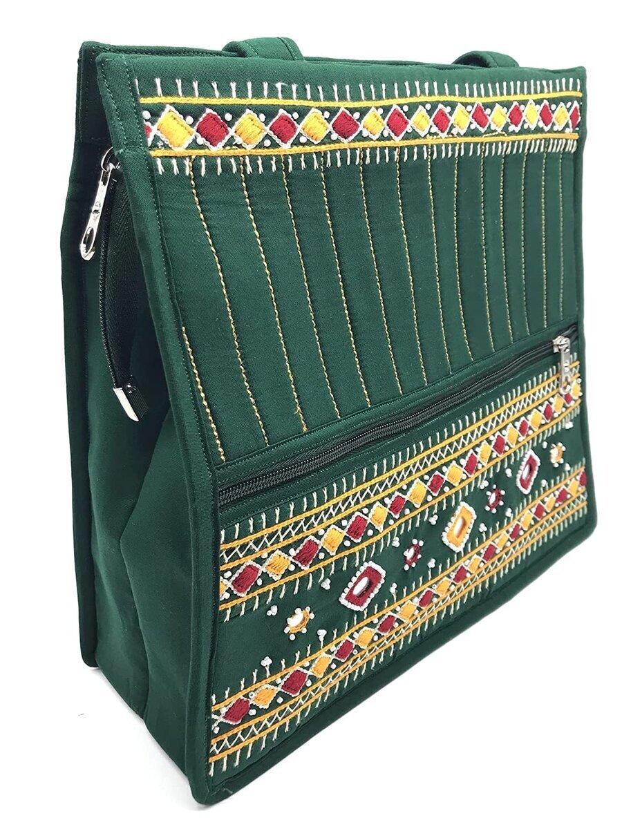 • (Material) A soft high quality Cotton (Poplin Fabric) with heavy duty zipper bag. A Piece of Art, Banjara Embroidery , With tiny Mirrors, Beads , Shells and Colourful Thread work called Traditional Banjara needle craft . When you touch the bag feel smooth, Craft Design on Both side, easy to wear and carry