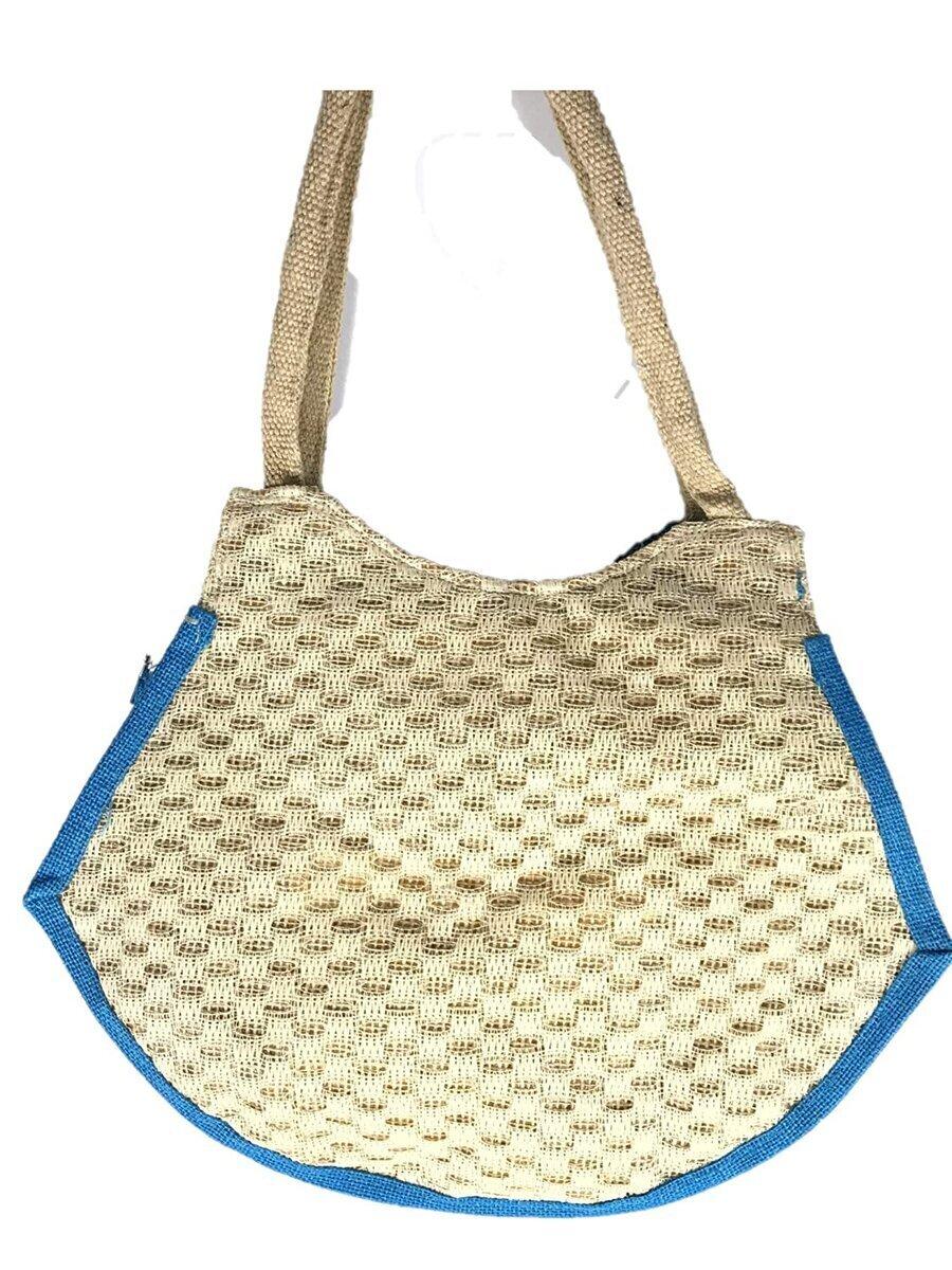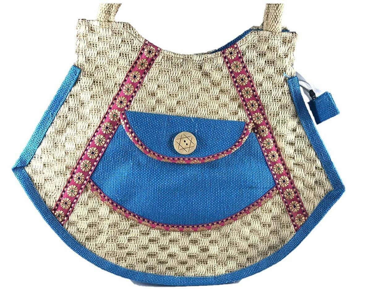 SriShopify Handcrafts Embroidered Eco friendly Women’s Jute Handbag, Tote Bag (Medium, Blue), luxury jute bag, Natural bag, Daily use Shopping Bag, premium shoulder bag