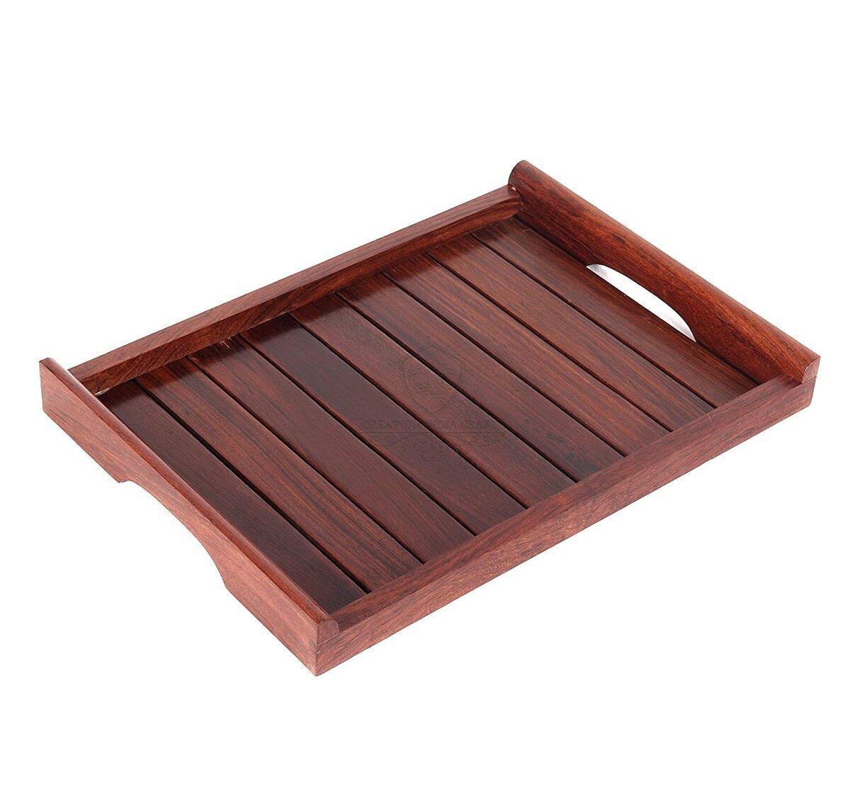 Constructed from premium quality wooden material, this tray is highly durable in nature. This tray is very elegant in design with strips on the surface that add a distinctive & classy touch when kept on the dining table. The handles are given a curved finish which reflects sophistication. These trays make serving tea, snacks, coffee, finger foods, cakes cheeses, bread & crackers great for parties & events. This wooden tray is ideal for serving food, decorating your home & cutting clutter in any space. The wooden tray is heat resistant so that you can serve hot tea & other hot snacks without any trouble at all. It provides a perfect touch to your kitchen & dining collections.