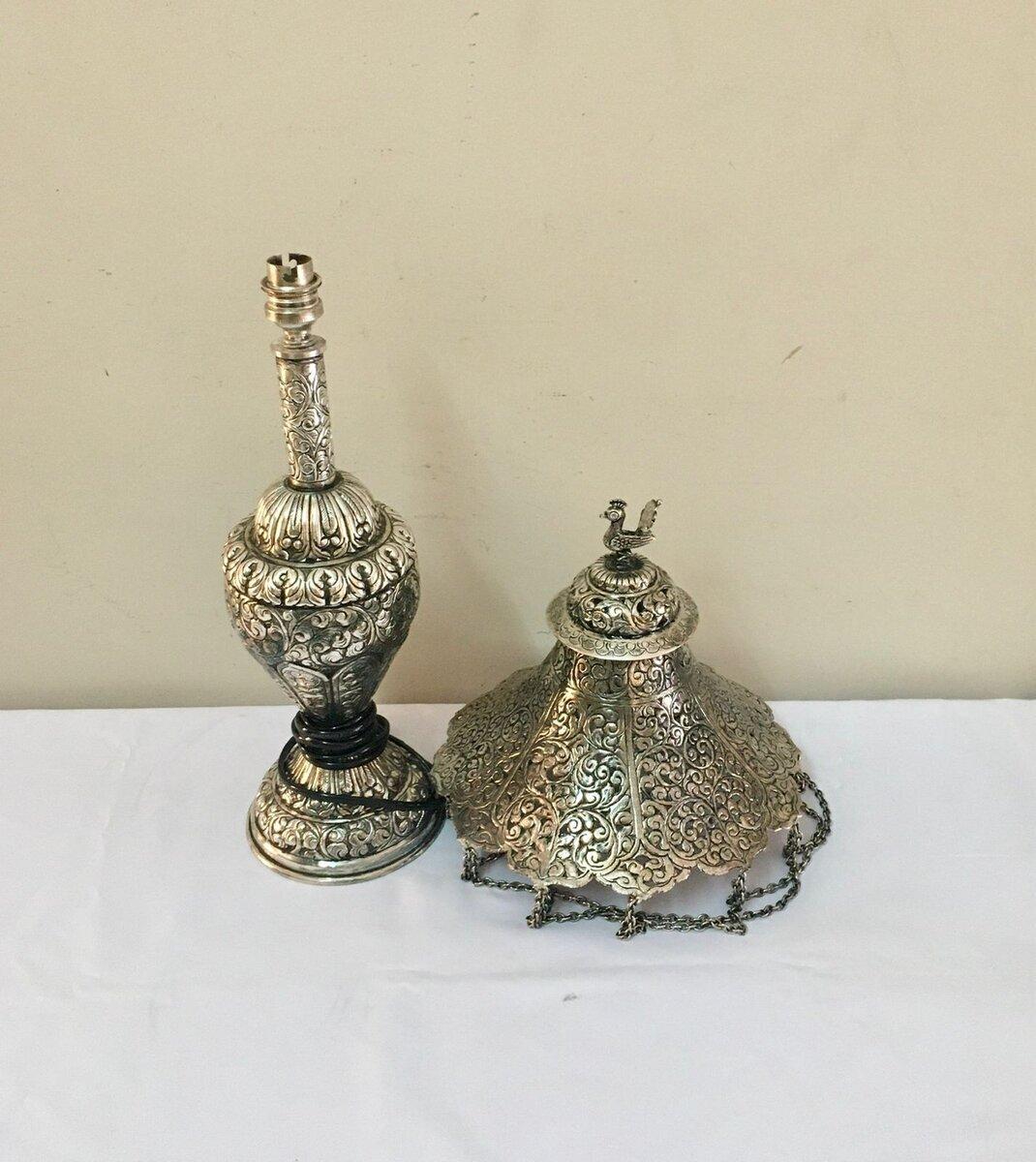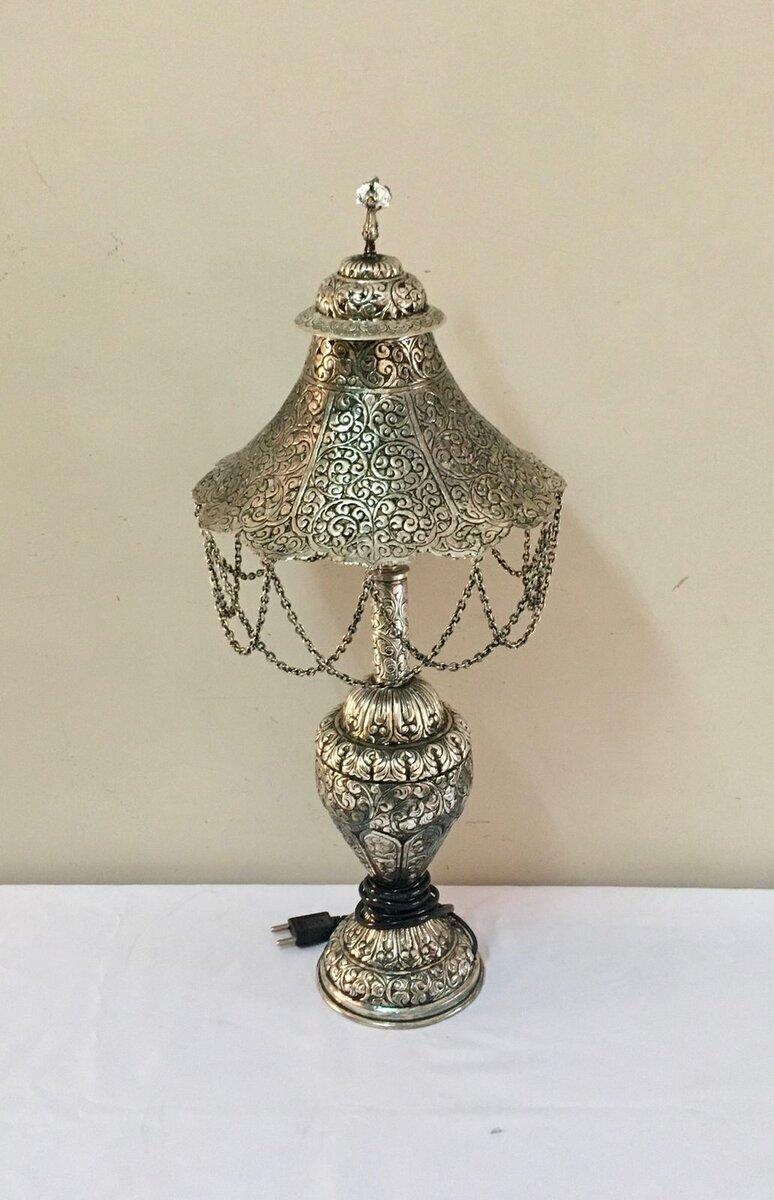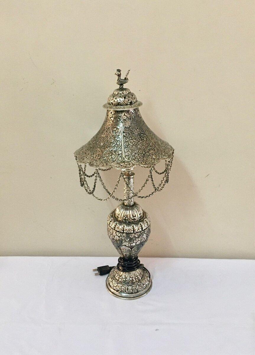 Silver polished on Brass Electric Lamp with old look and a beautiful carving, Showpieces Decorative Item, Home Decorative item, Antique Style
