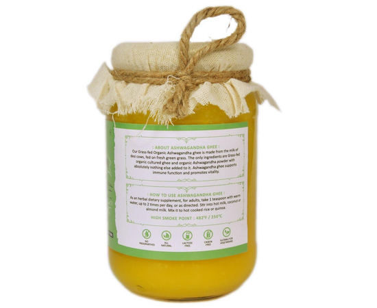 Our Grass-fed Organic Ashwagandha ghee is made from the milk of desi cows, fed on fresh green grass. The only ingredients are Grass-fed organic cultured ghee and organic Ashwagandha powder with absolutely nothing else added to it. Ashwagandha ghee supports immune function and promotes vitality.