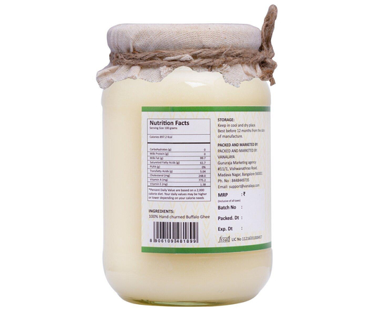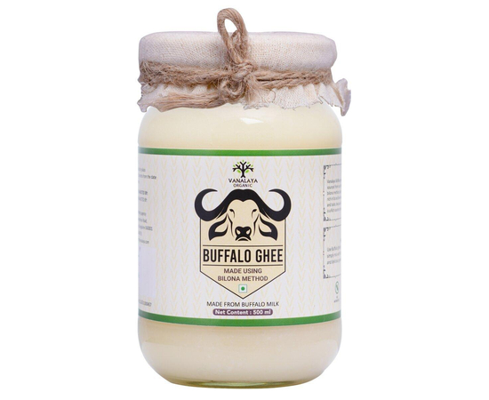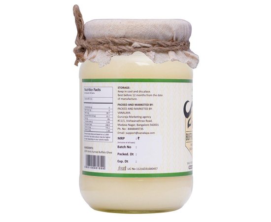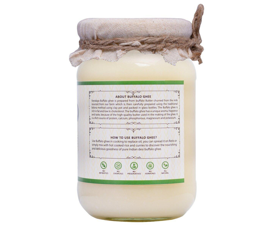 Buffalo Ghee is prepared from buffalo butter churned from the milk sourced from Vanalaya's farm, which is then carefully packed using the traditional Bilona method using a clay pot and packed in a glass bottle. Buffalo ghee is rich in fat and low in cholesterol. It has a unique aroma and taste because of its high-quality butter used in the making of ghee