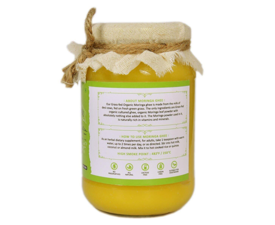 Our Grass-fed Organic Moringa ghee is made from the milk of desi cows, fed on fresh green grass. The only ingredients are Grass-fed