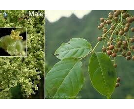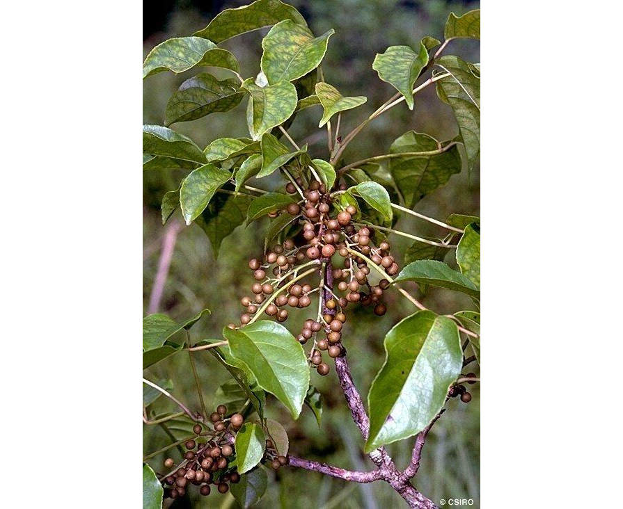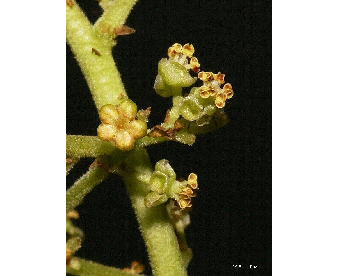Bischophia Javanica trees are commonly 12-18 m (35-60 ft) in height, with dense, rounded heads, smooth branches, and milky sap. Leaves alternate, long-petioled, trifoliolate (3 leaflets); leaflets shiny, bronze-toned, oval-elliptic, 15-20 cm (6-8 in) long, with margins small toothed. Flowers tiny, without petals, greenish-yellow, in many-flowered clusters (racemes) at leaf axils; male and female flowers on separate plants (dioecious). Fruit pea-sized, berrylike, fleshy, to 9 mm (0.33 in) in diameter, brown or reddish or blue-black, 3-cell