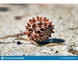 Whistling Pine is a common tropical seashore tree and is often planted as a windbreak. Whistling Pine has a conifer-like appearance which is increased by hanging green branchlets and cone-like fruits. The species name equisetifolia refers to the resemblence of the leaves to a horse’s tail. The soft singing of the air through its innumerable slender twigs is a pleasant sound, which lends it the common name Whistling Pine. It is a large vase-shaped tree that grows 100-150 ft in height with wispy grey green twigs reminiscent of pine needles. The weeping branchlets look a little like jointed rushes and are ringed at their nodes by tightly overlapping little scalelike leaves. The stout trunk is covered with thick pebbly textured brownish grey bark. The male flowers are borne in slender cylindrical spikes at the twig tips. The tiny brownish red female flowers grow in heads attached to the branchlets and are followed by 0.5 in diameter fruits that resemble pinecones and contain 70-90 winged seeds each. The wood is hard and is almost unworkable by carpenters. It also cracks and splits easily and so is more suitable for beams or posts than planks, but does not last long underground. The chief use is as fuel for which a tree may be cut when 10 to 12 years old, although it is better left until about 20.